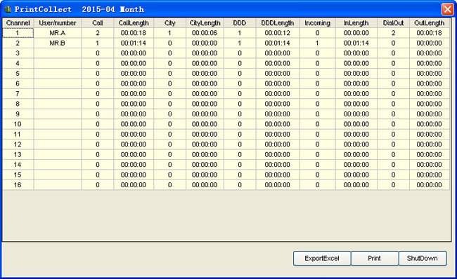 9 Print and collect table interface. Can do some statistics about dial in / out times and conversation duration by month or day.It also can export the results to Excel.