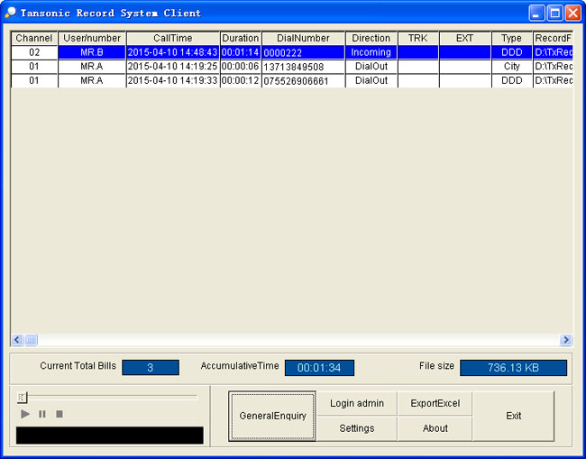 After the recording system is connected to PBX ,and use “Tansonic SMDR System”together,it will record the extension particular information.