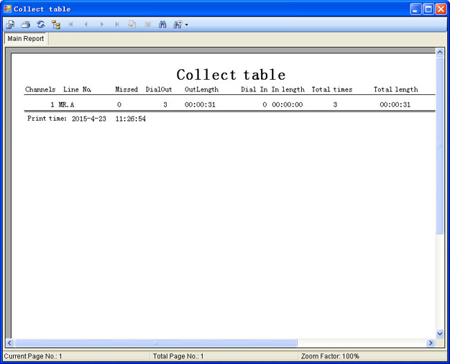 10 Print and collect table interface. Can do some statistics about dial in / out times and conversation duration by month or day.It also can export the results to Excel.