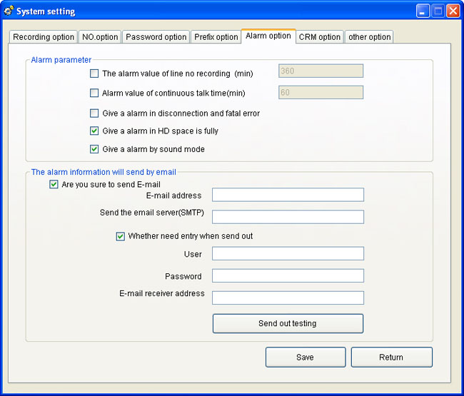 The user can set more kinds alarm remind,such as the harddisk space lack of,recording system disconnection,conversation delay and so on .After setting ,the system will send email to inform the administer.