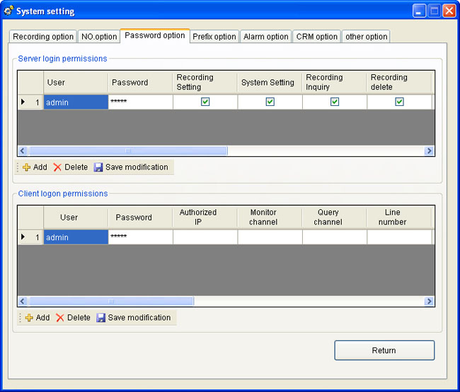 The user can set more kinds alarm remind,such as the harddisk space lack of,recording system disconnection,conversation delay and so on .After setting them,the system will send email or make some sound to inform the administer.