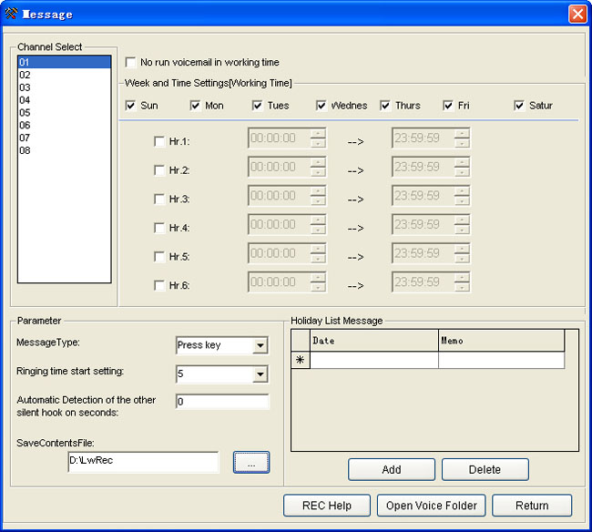 12 Message settings interface. Each channel can play freely by different voice files, can be played by holiday , weekly , time period and channel .