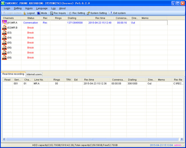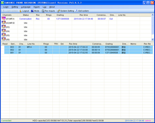 8 . Inquiry Interface.The user can do some inquiry ,playback and remark the recording file and other features here.